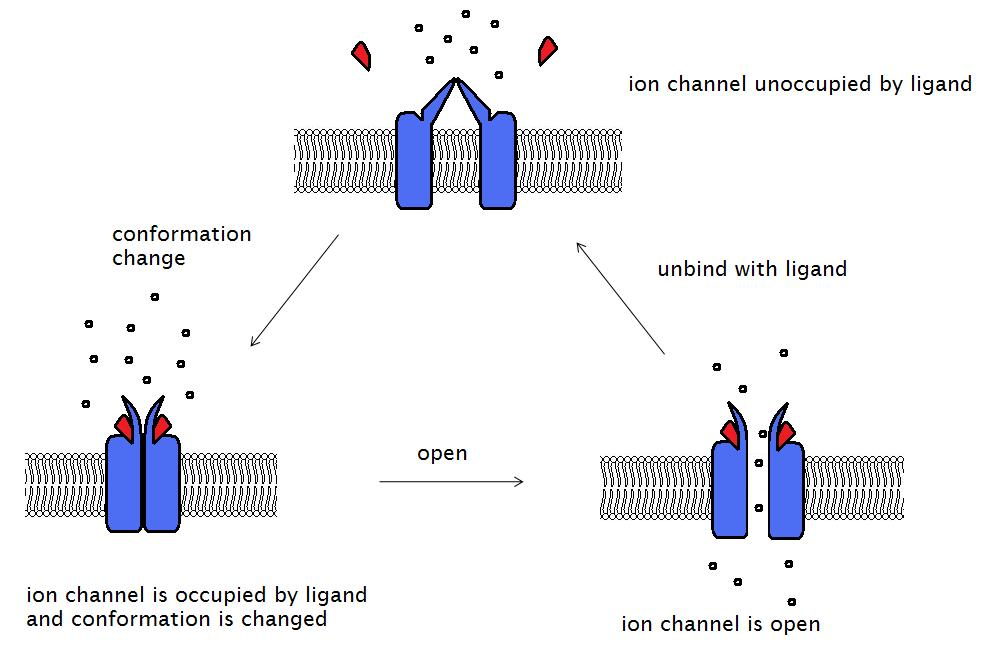 During the signal transduction event in a neuron, the neurotransmitter binds to the receptor and alters the conformation of the protein. This opens the ion channel, allowing extracellular ions into the cell. Ion permeability of the plasma membrane is altered, and this transforms the extracellular chemical signal into an intracellular electric signal which alters the cell excitability.