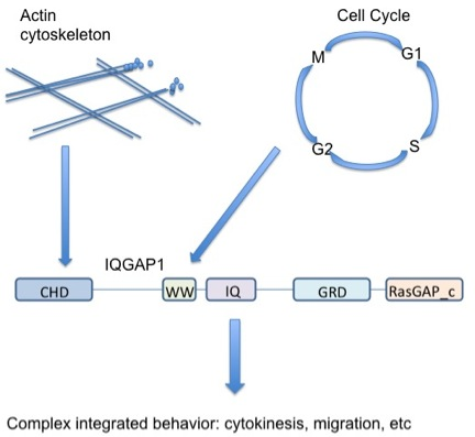 To simplify, due to its diverse range of binding partners, IQGAP1 may act as a link between logically related but molecularly distinct cellular functions. In the above example, actin cytoskeleton rearrangement is required for proliferation (cytokinesis during mitosis). IQGAP1 helps cells both listen to and act on signals, playing an integral role in connecting the dots between signals for proliferation and the actual cellular response.