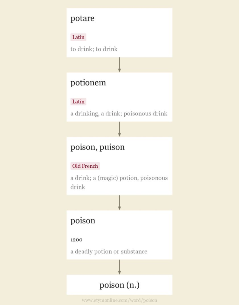 Harper, Douglas. “Etymology of poison.” Online Etymology Dictionary, https://www.etymonline.com/word/poison. Accessed 11 January, 2023.