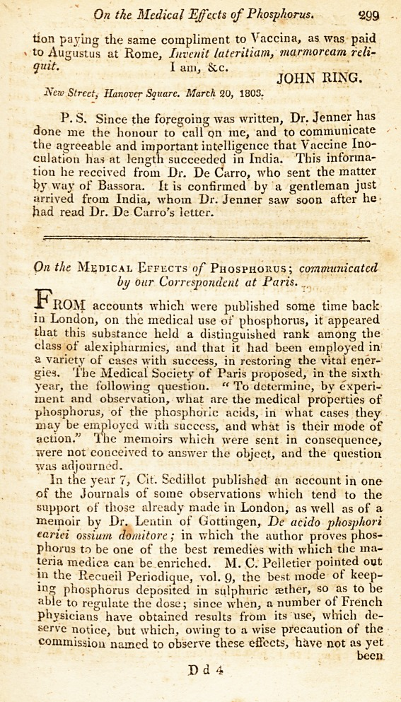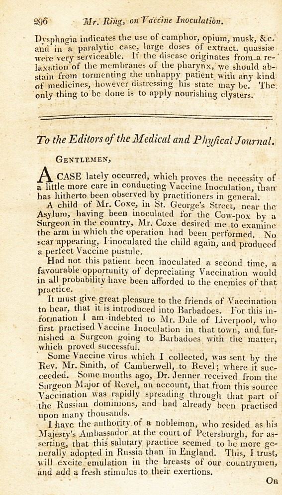 Ring, John. “Mr. Ring, on Vaccine Inoculation.” The Medical and physical journal vol. 9,50 (1803): 296-299.