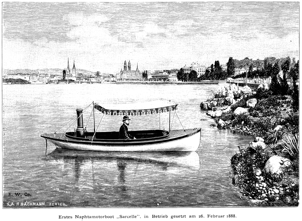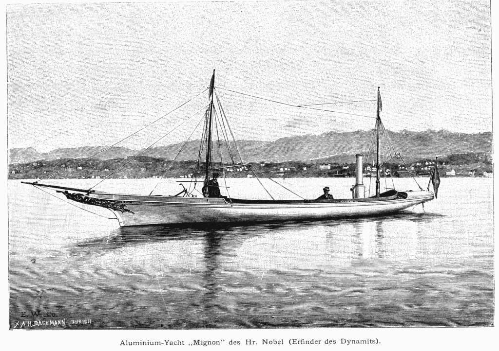 The first naphtha launch appears to have been British, reported in the French journal La Nature in 1888. This launch, Zephyr, was the invention of Alfred Yarrow, a well-known builder of steam launches for some years previously. Similar launches were produced in the same year by the Swiss company Escher Wyss AG. One of these was Alfred Nobel‘s graceful aluminium-hulled sloop Mignon, of 1892. Another, also of aluminium, was the Aluminia of 1894.
