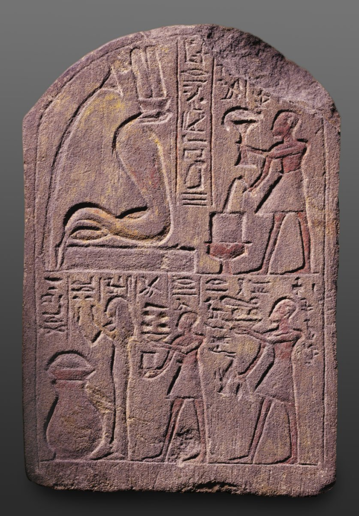 Renenutet as a snake-headed woman seated in front of Nepit (left) and Hu (center) in the form of cobrasStela with the Representation of the Goddess Renenutet, 1295–1069 B.C. Museum of Fine Arts, Budapest. The surface of this stela is slightly damaged, however, traces of yellow and red ochre paint is still visible. In the upper left corner, Renenutet, a snake goddess of the harvest and victuals is depicted wearing the double feather crown. She is also identified with the ureus-snake providing protection against enemies; her cult was particularly popular during the New Kingdom. On the right side of the register, a man is offering water and fowl to the goddess whom the vertical hieroglyphic inscription refers to as “Nekhbet-Renenutet”. Nekhbet, the protector goddess of Upper Egypt, was usually represented as a vulture or cobra. Similarly to Renenutet, she was responsible for sustenance and provided protection against enemies. In the lower register, there are three figures; from left to right, the wife and the sons of the man presenting offerings to the goddess above. A large, closed jar stands in front of them in which the family may have kept a living cobra thus Renenutet was worshipped not only in a temple cult but a house cult as well. The stela probably originates from Deir el-Medina, the purpose-built settlement of the craftsmen who prepared the royal tombs in the Valley of the Kings during the New Kingdom. Renenutet was depicted as a cobra, or as a woman with the head of a cobra and was also called the “Lady of Fertile Fields” and “Lady of Granaries.”