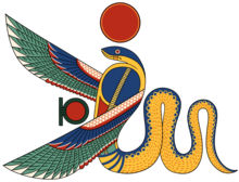 A representation of the Egyptian Deity Wadjet as a Snake with a Solar Disk, spreading her wings as he was depicted in The Tomb of Nefertari, 1255 BCE. This image contains some artistic liberties so that Wikipedia readers can tell her apart from the rest of the Egyptian Deities.