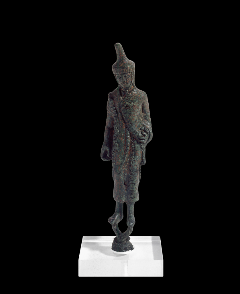 There is an interesting collection in the Museum of small bronzes of human figures, relative in most cases to the sphere of worship in the Etruscan and Italic environment. This statue portrays a haruspex, that is an Etruscan priest who interpreted the will of the gods by examining the liver of the animals sacrificed [cf. mirror with Calchas]. The clothing is characterized by the high headdress of skin or felt tied under the chin, because it was a bad omen if the hat of the priest fell during the ceremonies. From the right bank of the Tiber Fourth century B.C. Full cast bronze, height 17.7 cm Cat. 12040 Vatican Museums Online, Gregorian Etruscan Museum, Room III