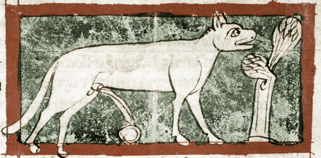 MS. Douce 88 , Manuscript on paper, Bestiary, English Date: 13th century, end Folio or page no.: fol. 008r Whole page or detail: detail Image description: Lynx. Roll title: MS. Douce 88, parts B-C (Bestiary texts). As is usual in bestiaries, the lynx is shown urinating, the urine turning to the mythical stone lyngurium