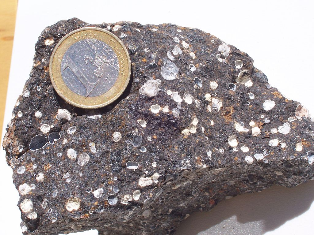Amygdales/amygdules (filled vesicles) of apatite & quartz in a basaltic lava from the Kaiserstuhl, Southern Germany