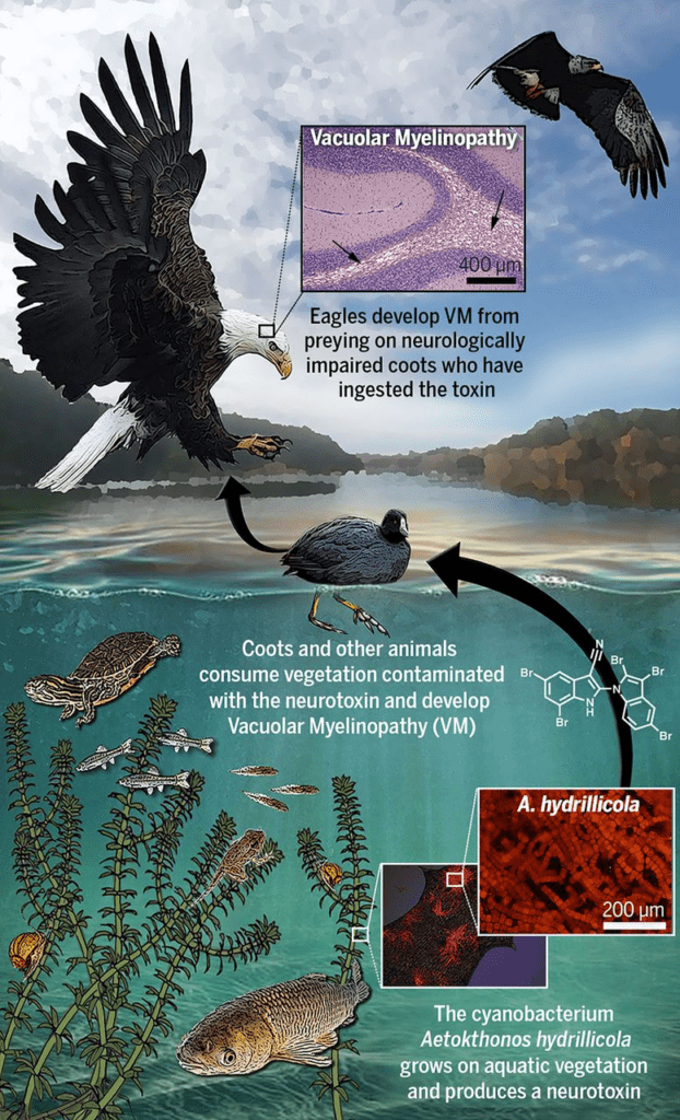 Aetokthonotoxin (AETX), colloquially ‘eagle toxin’, was discovered in 2021 as the cyanobacterial neurotoxin causing vacuolar myelinopathy (VM) in eagles in North America.