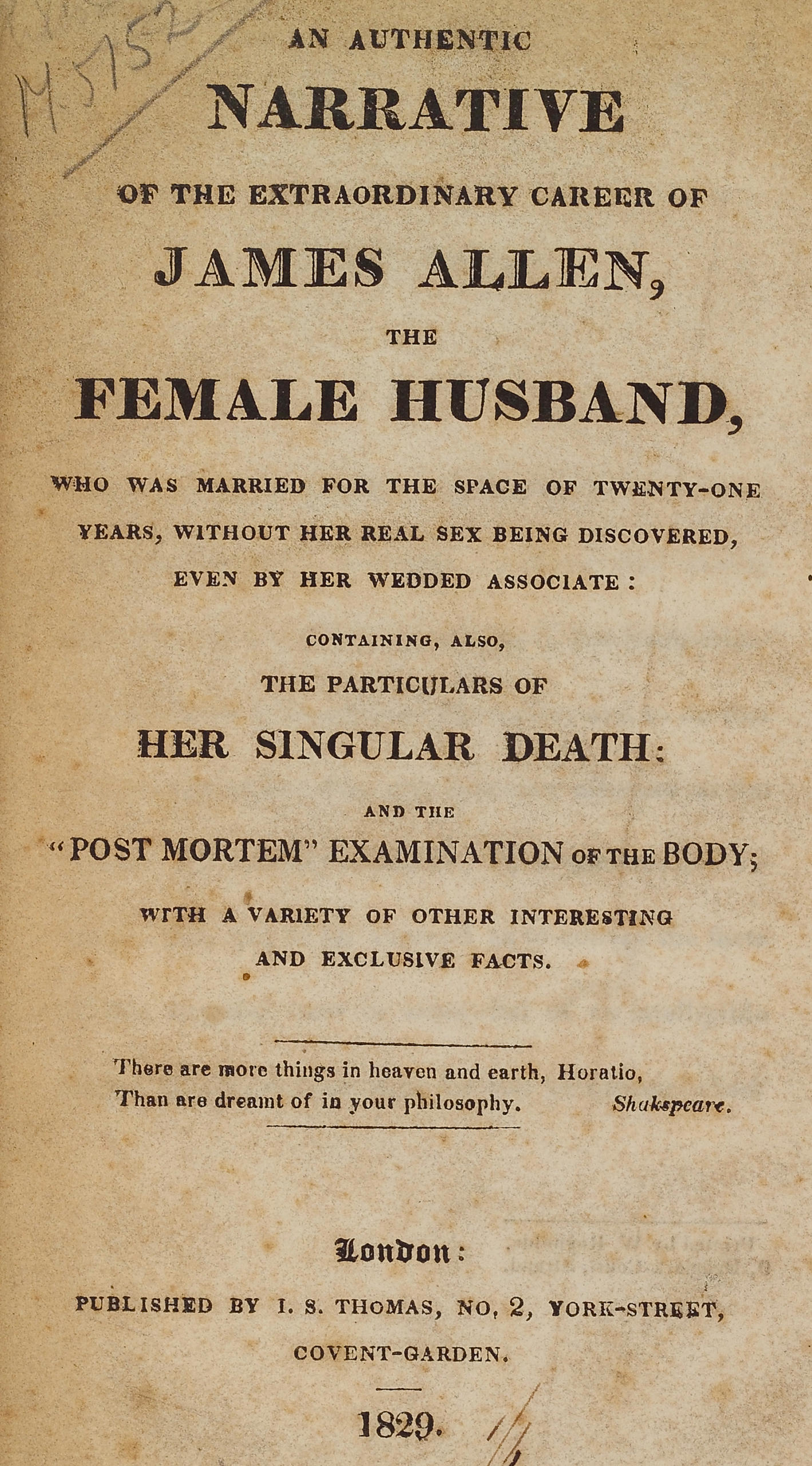 In 1829 it was reported that another female husband, James Allen, had successfully lived as a man without facing prosecution for 21 years. Allen had married Abigail (née Naylor) in 1807 at St Giles’ Church, Camberwell. It was only under autopsy at St Thomas’ Hospital, London, that his sex was discovered to be female. Abigail said she “was not suspicious of her husband’s sex because Allen was uncannily strong”. She felt that she was threatened by her neighbours and the only way they would leave her alone would be to swear she had no idea. A sensational pamphlet purported to provide the public with “An Authentic Narrative of the Extraordinary Career of James Allen, the Female Husband […]”.