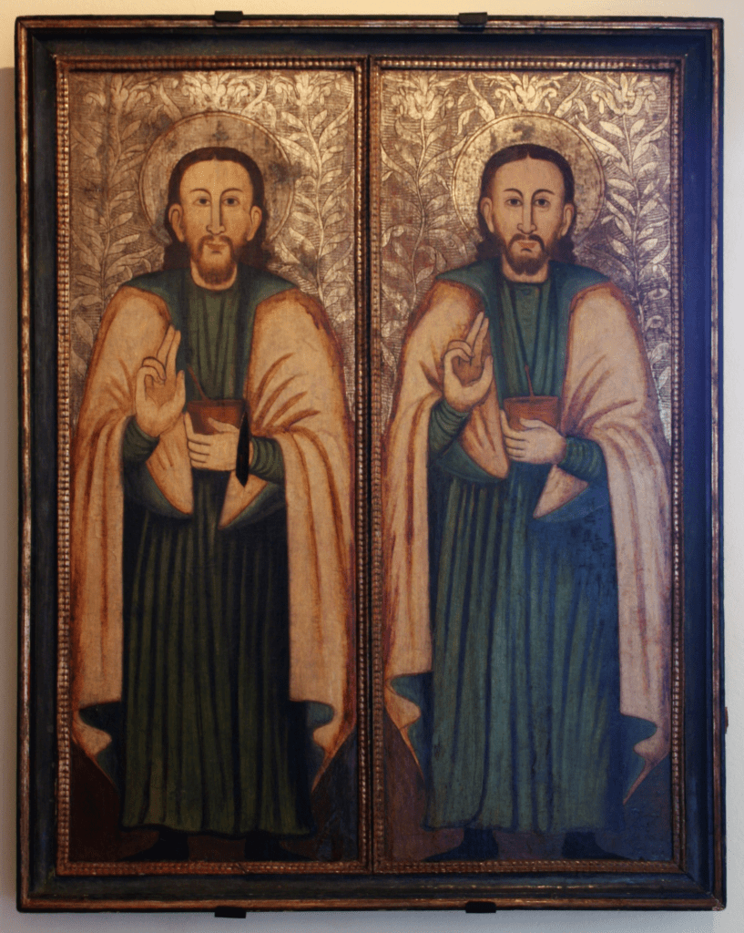 Cosmas and Damian were third century Arabian-born twin brothers who embraced Christianity and practised medicine and surgery without a fee. This led them to being named anargyroi (from the Greek Ἀνάργυροι, ‘the silverless’ or ‘unmercenaries‘); by this, they attracted many to the Christian faith. They reputedly cured blindness, fever, paralysis and reportedly expelled a breast serpent. They were arrested by Lysias, governor of Cilicia (modern day Çukurova, Turkey) during the Diocletian persecution because of their faith and fame as healers. Emperor Diocletian was a religious fanatic and favoured the pantheism of the Olympian Gods. He issued a series of edicts that condemned the Christians in his attempt to wipe out Christianity from his empire.