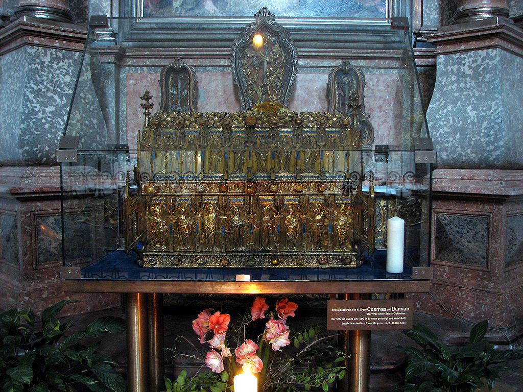What are said to be their skulls are venerated in the Convent of Las Descalzas Reales of the Clares in Madrid, where they have been since 1581, the gift of Maria, daughter of Emperor Charles V. They had previously been removed from Rome to Bremen in the tenth century, and thence to Bamberg. Other skulls said to be theirs were discovered in 1334 by Burchard Grelle, Archbishop of Bremen. He “personally ‘miraculously’ retrieved the relics of the holy physicians Cosmas and Damian, which were allegedly immured and forgotten in the choir of the Bremen Cathedral. In celebration of the retrieval Archbishop and Chapter arranged a feast at Pentecost 1335, when the relics were translated from the wall to a more dignified place. Grelle claimed the relics were those Archbishop Adaldag brought from Rome in 965. The cathedral master-builder Johann Hemeling made a shrine for the relics, which was finished around 1420. The shrine, made from carved oak wood covered with gilt and rolled silver is considered an important mediaeval gold work. In 1649 Bremen’s Chapter, Lutheran by this time, sold the shrine without the heads to Maximilian I of Bavaria. The two heads remained in Bremen and came into the possession of the small Roman Catholic community. They were shown from 1934 to 1968 in the Church of St. Johann and in 1994 they were buried in the crypt. The shrine is now shown in the Jesuit church of St Michael in Munich. At least since 1413 another supposed pair of skulls of the saints has been stored in St Stephens’s Cathedral in Vienna. Other relics are claimed by the Church of San Giorgio Maggiore in Venice.