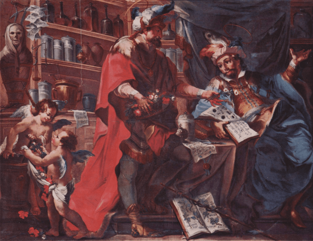 Among the attributes of the frequently depicted saints are medical instruments and medicinal containers, with Kosmas mostly as a studied doctor with a urine glass (Matula) and Damian as a skilled surgeon and from the 13th century mainly as a pharmacist with an ointment jar or a “travel pharmacy”. (usually with an ointment spatula). The brothers are rarely depicted with their martyrdom symbols of sword and palm branch. They are often depicted in the clothes of medieval doctors in red cloaks and red round hats.