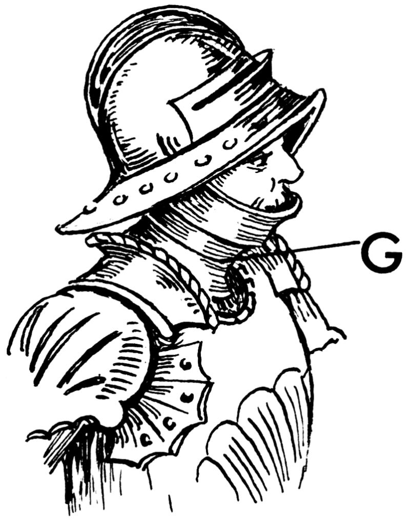 By the 17th century there appeared a form of gorget with a low, unarticulated collar and larger front and back plates which covered more of the upper chest and back. In addition to being worn under the breast & backplates, as evidenced by at least two contemporary engravings, they were also commonly worn over civilian clothing or a buff coat. Some gorgets of this period were “parade” pieces that were beautifully etched, gilded, engraved, chased, embossed or enameled at great expense. Gradually the gorget grew smaller and more symbolic, becoming a single crescent shape worn on a chain which suspended the gorget ever lower on the chest, so that the gorget no longer protected the throat in normal wear.