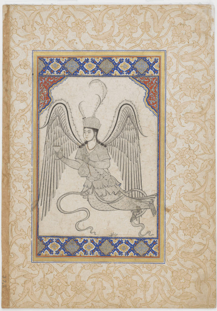 The character of the Peri, as a supernatural wife, shares similar traits with the swan maiden, in that the human male hides the Peri’s wings and marries her. After some time, the Peri woman regains her wings and leaves her mortal husband.