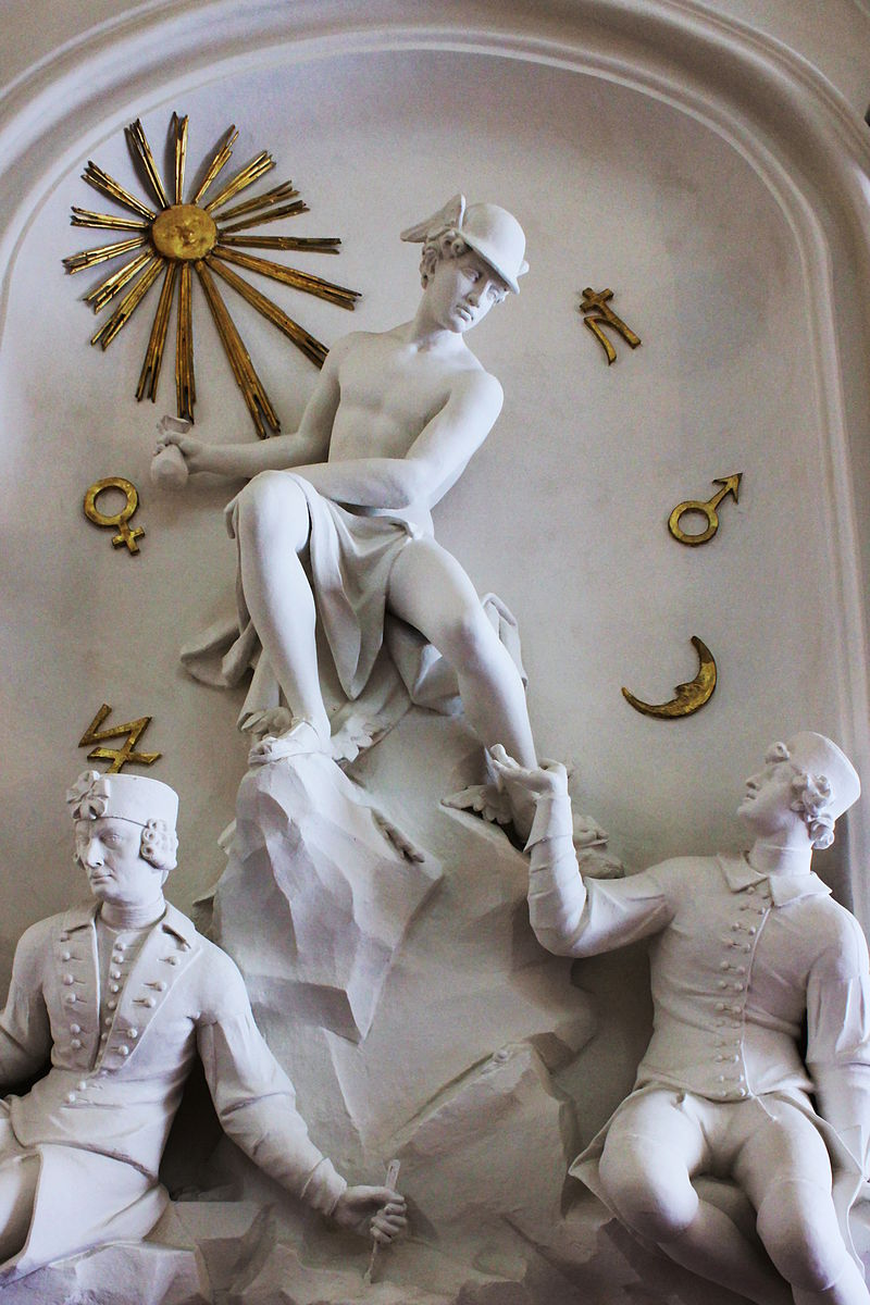 It has been surmised that one explanation for the scepticism of these last two fables was that Hermes was the god of trade and merchants and the Greeks had a certain ambivalence towards wealth making. The 10th century Byzantine Greek lexicon known as the Suda explains what form of statue is involved here. “They say Hermes was responsible for profit and an overseer of the businesses: consequently they set up the statue of him weighing a purse.” It is to such sculptures that the statue on the stairs of the Winter Palace of Prince Eugene in Vienna can be referred, although it is itself ambiguous. The sculptor rests with chisel in hand on the statue’s right as it looks down towards another similarly dressed individual on the other side who raises his hand towards the god. It might therefore remind viewers of the first of the fables here, which was well known. But it is the purse held well away in the god’s right hand which seems to be drawing the gaze of the man below, whose hand is cupped as if in supplication. The statue can therefore be read alternatively as referencing either of the last two fables here.