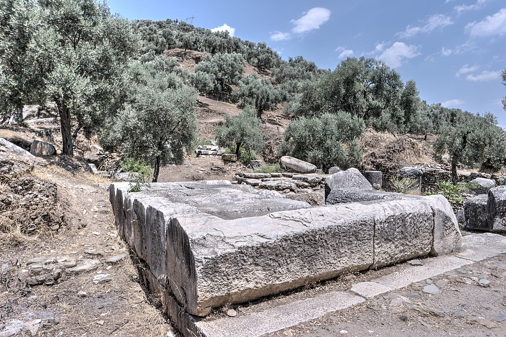 The city had an oracle of Pluto and Kore (Persephone) at Acharaca. A large grove, a Doric temple (remains of which survive), and a cave called the Charonium, were the seat of the oracle. Strabo noted that “The sick resort thither, and live in the village near the cave, among experienced priests, who sleep at night in the open air and direct the mode of cure by their dreams. The priests invoke the gods to cure the sick, and frequently take them into the cave, where they remain in quiet without food for several days. Sometimes the sick themselves observe their own dreams, but apply to the priests to interpret them. To others the place is interdicted and fatal.”