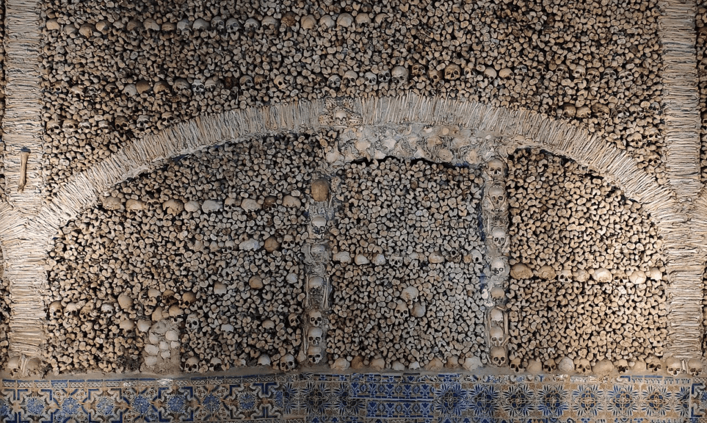 The Capela dos Ossos (English: Chapel of Bones) is one of the best-known monuments in Évora, Portugal. It is a small interior chapel located next to the entrance of the Church of St. Francis. The Chapel gets its name because the interior walls are covered and decorated with human skulls and bones.