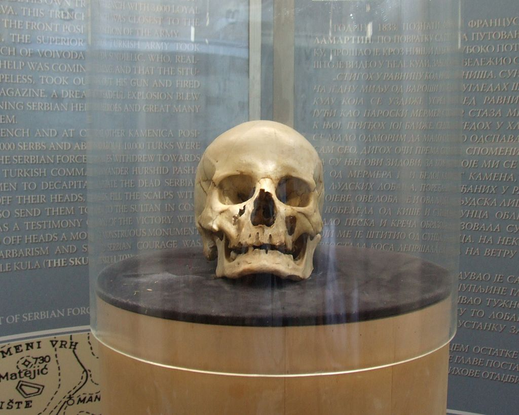 After the battle, the governor of the Rumelia Eyalet, Hurshid Pasha, ordered that the heads of Sinđelić and his men be skinned, stuffed and sent to the Ottoman sultan, Mahmud II. Upon being viewed by the sultan, the skulls were then returned to Niš, where the Ottomans built Skull Tower as a warning to residents contemplating rebellion. The Ottoman Empire was known to create tower structures from the skulls of rebel fighters in order to elicit terror among its opponents. Skull Tower was constructed on the road from Istanbul to Belgrade. It was built of sand and limestone. The structure is 4.5 metres (15 ft) high. It originally consisted of 952 skulls embedded on four sides in 14 rows. The locals named it ćele kula, from the Turkish kelle kulesi, which means “skull tower”.