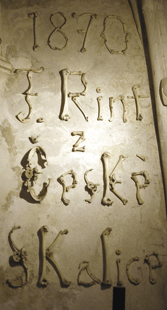 In 1870, František Rint, a woodcarver, was employed by the Schwarzenberg family to put the bone heaps into order, yielding a macabre result. The signature of Rint, also executed in bone, appears on the wall near the entrance to the chapel.