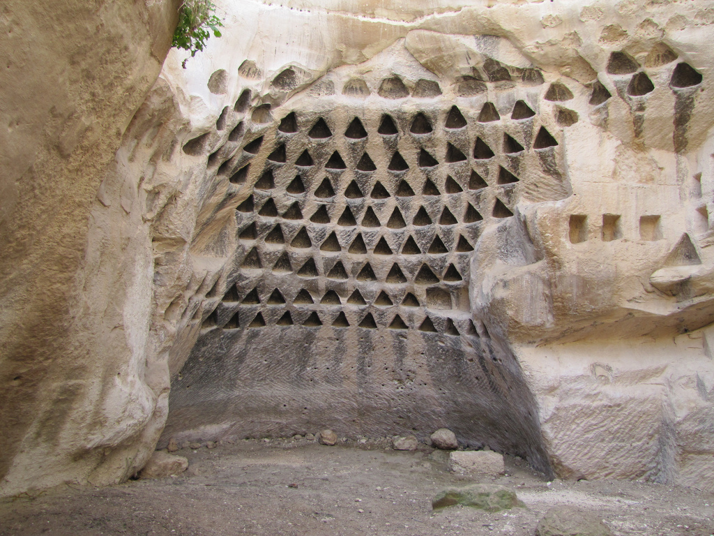 In the Beit Guvrin area several series of large caves dug into soft rock were found. There were several theories about their original use, for ritual burial, for growing pigeons to be used for ritual sacrifice, or for raising pigeons for fertilizer production. One such cave had been covered by an earthquake close to the time of its original usage and had no signs of secondary usage; neither ashes nor pigeon droppings were found in it.