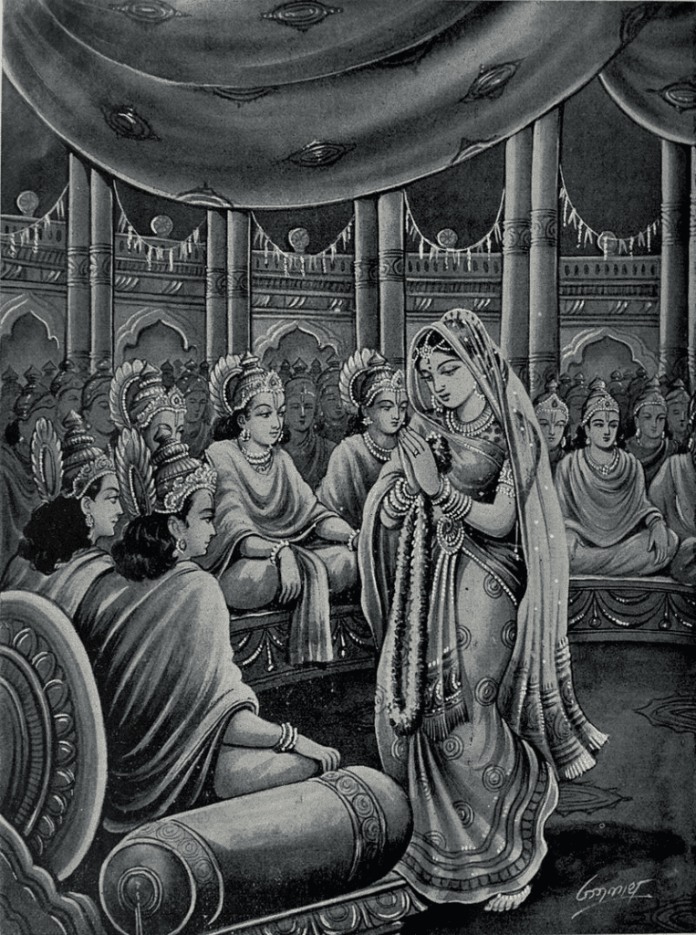 Several Indo-European myths from the Indic, Greek, and possibly the Iranian tradition, recount similar stories of princesses who choose their future husband during their own wedding or via a competition between the suitors. The Indic tradition codified this peculiar form of marriage and called it svayamvara (‘personal choice’). In Rāmāya, Sita chooses Rama as her husband, as Damayanti chooses Nala after she saw him in a dream in the Mahābhārata, and as Tyndareus lets Helen choose her own husband in Euripides‘ Iphigenia in Aulis. Additionally, both Penelope in Homer‘s Odyssey and Draupadī in the Mahābhārata make their choice in the form of an archery competition between their suitors.