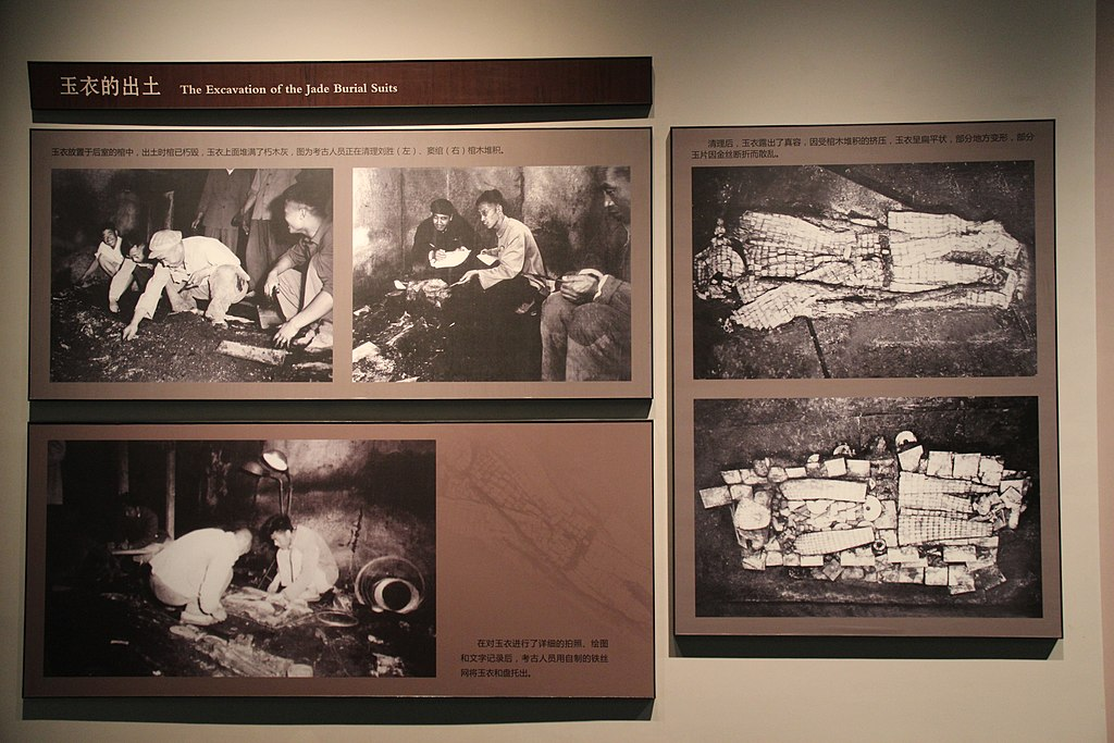 Since the first jade burial suits discovery, there have been multiple additional findings. In 1973, a jade burial suit belonging to Prince Huai of the Western Han Dynasty was discovered in DingxianHebei. It consisted of 1,203 pieces of jade and 2,580 grams of gold thread. In 1983, a jade suit was found in the tomb of Zhao Mo, the second king of Southern Yue, in Guangzhou. The red silk thread used to bind the 2,291 jade plates represented Zhao Mo’s immersion into local culture. It is exhibited in the local Museum of the Mausoleum of the Nanyue King. In 1991, a jade burial suit was excavated from a group of monumental tombs of the King of Chu, Liu Wu, in Xuzhou. This magnificent, life-sized jade and gold burial suit survived very much intact, thereby possessing a high value for artistic appreciation.