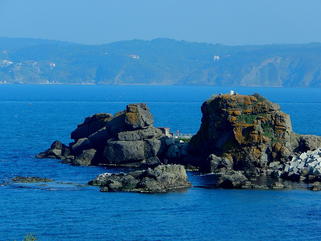 The European rock is usually identified with an islet, about 20 metres (66 ft) wide and 200 metres (660 ft) long, which stands about 100 metres (330 ft) off the shore of a village called Rumelifeneri (‘Lighthouse of Rumeli’), and is connected to it by a modern concrete jetty. At its highest point, there is an ancient altar known as the Pillar of Pompey, though it has nothing to do with Pompey. Dionysius of Byzantium mentions a Roman shrine to Apollo on one of the Cyanean Rocks, and the 16th-century French traveller Petrus Gyllius thought the altar was a remnant of that shrine.