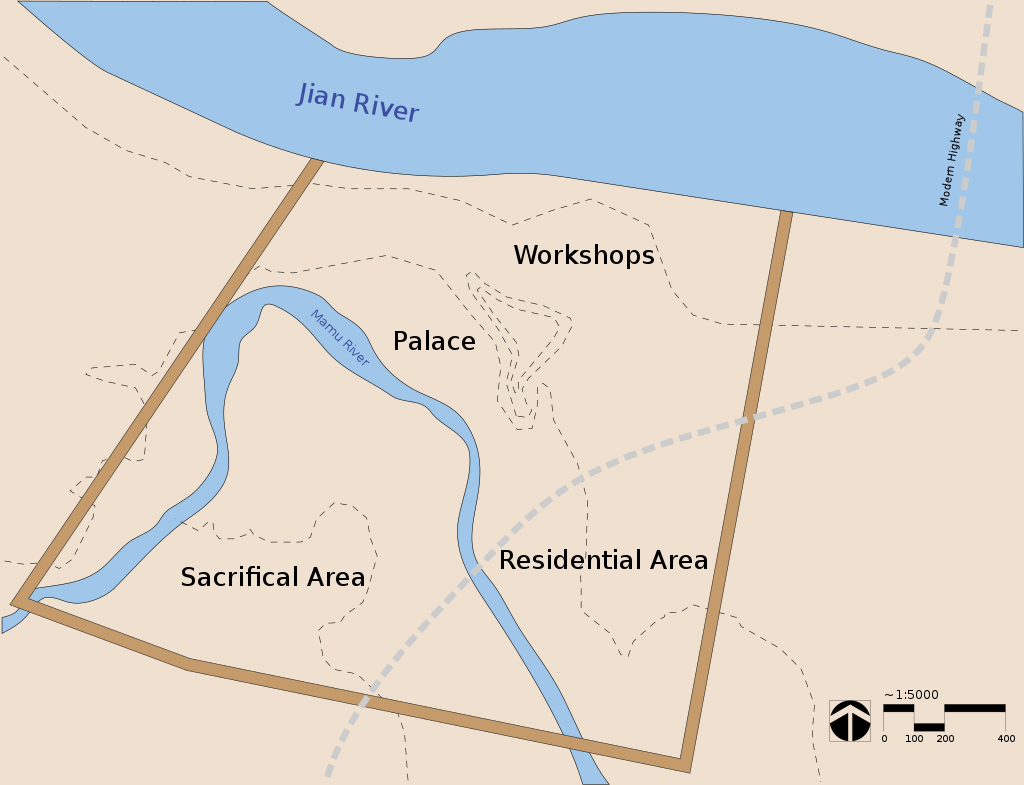 The city was built on the banks of the Yazi River (Chinese: 涧河; pinyin: Jiān Hé), and enclosed part of its tributary, Mamu River, within the city walls. The city walls were 40 m at the base and 20 m at the top, varying in height from 8–10 m. There was a smaller set of inner walls.