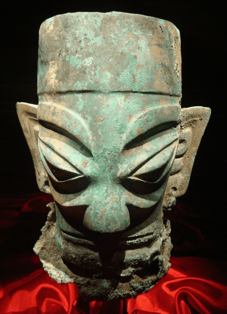 Another scholar compares these “bulging-eyed, big-eared, bronze heads and masks” with “eye-idols” (effigies with large eyes and open mouths designed to induce hallucinations) in Julian Jaynes‘s bicameral mentality hypothesis; and proposes, “[i]t is possible that southern Chinese personators wore these hypnotic bronze masks, recursively representing the spirit of a dead ancestor with a mask that represents a face disguised by a mask”.