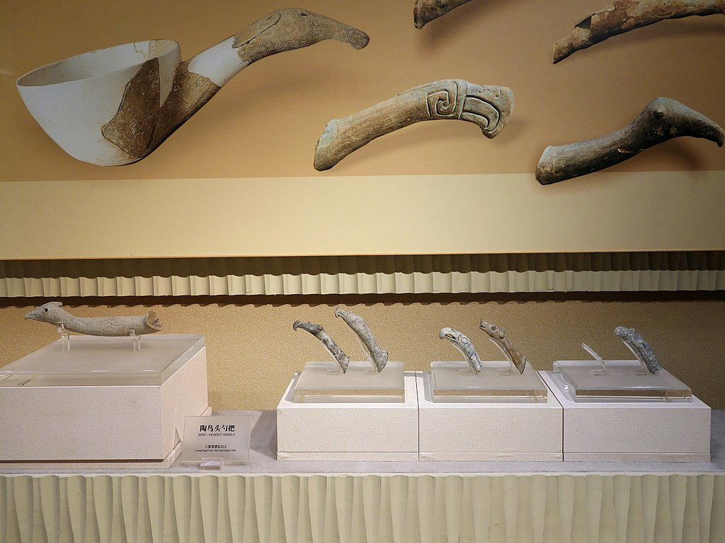 Sanxingdui (Chinese: 三星堆; pinyin: Sānxīngduī; lit. ‘Three Star Mound‘) is an archaeological site and a major Bronze Age culture in modern Guanghan, Sichuan, China. Largely discovered in 1986, following a preliminary finding in 1927, archaeologists excavated artifacts that radiocarbon dating placed in the twelfth–eleventh centuries BC. The archaeological site is the type site for the Sanxingdui culture that produced these artifacts, archeologists have identified the locale with the ancient kingdom of Shu. The artifacts are displayed in the Sanxingdui Museum located near the city of Guanghan.
