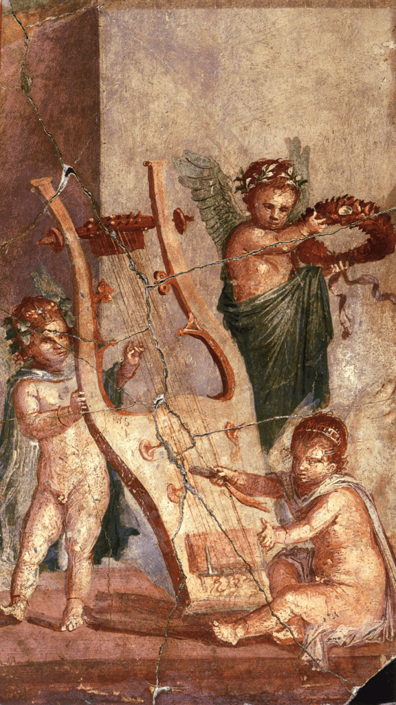 Herculanum (deposit) – Cupids playing with a lyre. Roman fresco from Herculanum (perhaps the Basilica) (detail).