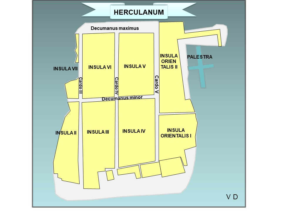 The classical street layout separates the city into blocks (insulae), defined by the intersection of the east–west (cardi) and north–south (decumani) streets. Hence Insula II to Insula VII run counterclockwise from Insula II. To the east are two additional blocks: Orientalis I (oI) and Orientalis II (oII). To the south of Orientalis I (oI) lies one additional group of buildings known as the “Suburban District” (SD). Individual buildings have their own entrance number. For example, the House of the Deer is labelled (Ins IV, 3).