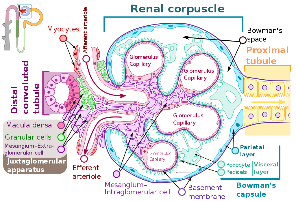 Juxtaglomerular cells secrete renin in response to a drop in pressure detected by stretch receptors in the vascular walls, or when stimulated by macula densa cells. Macula densa cells are located in the distal convoluted tubule, and stimulate juxtaglomerular cells to release renin when they detect a drop in chloride concentration in tubular fluid. Together, juxtaglomerular cells, extraglomerular mesangial cells and macula densa cells comprise the juxtaglomerular apparatus.