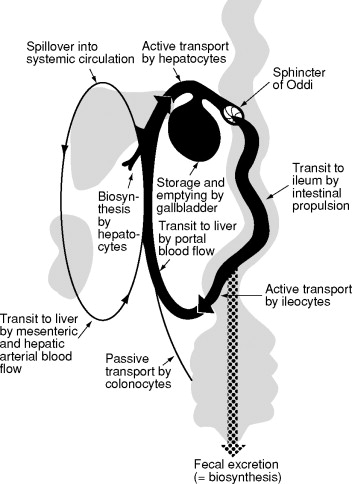 Bile acid molecules are unique in that they are restricted to the enterohepatic circulation (Figure 1). They are secreted in bile as glycine and taurine conjugates, and are mainly absorbed by active transport in the distal ileum. Many other endogenous and exogenous compounds undergo some degree of enterohepatic circulation, but this usually represents a minor component of their tissue distribution. By contrast with bile acids, these substances are excreted in bile as glucuronate or sulfate conjugates, and deconjugation by colonic bacteria is essential for these molecules to reenter the enterohepatic circulation by passive colonic absorption following biliary excretion.