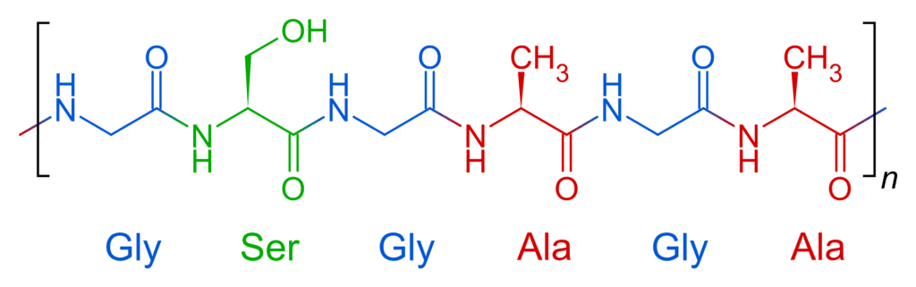 The heavy fibroin protein consists of layers of antiparallel beta sheets. Its primary structure mainly consists of the recurrent amino acid sequence (Gly–Ser-Gly-Ala-Gly-Ala)n. The high glycine (and, to a lesser extent, alanine) content allows for tight packing of the sheets, which contributes to silk’s rigid structure and tensile strength. A combination of stiffness and toughness make it a material with applications in several areas, including biomedicine and textile manufacture.
