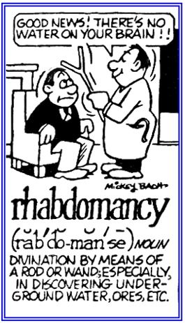 The word first appears in English in the mid-17th century (used in Thomas Browne‘s Pseudodoxia Epidemica, 1646), where it is an adaptation of Late Latin rhabdomantia, from a presumed (unrecorded) ancient Greek *rhabdomanteia, from the ancient Greek ῥάβδος (rhabdos) a rod.