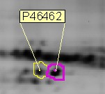 Example of posttranslational modification detected on a 2D gel (spot boundaries delimited by analysis software, identification by mass spectrometry, P46462 is the protein ID in Expasy)