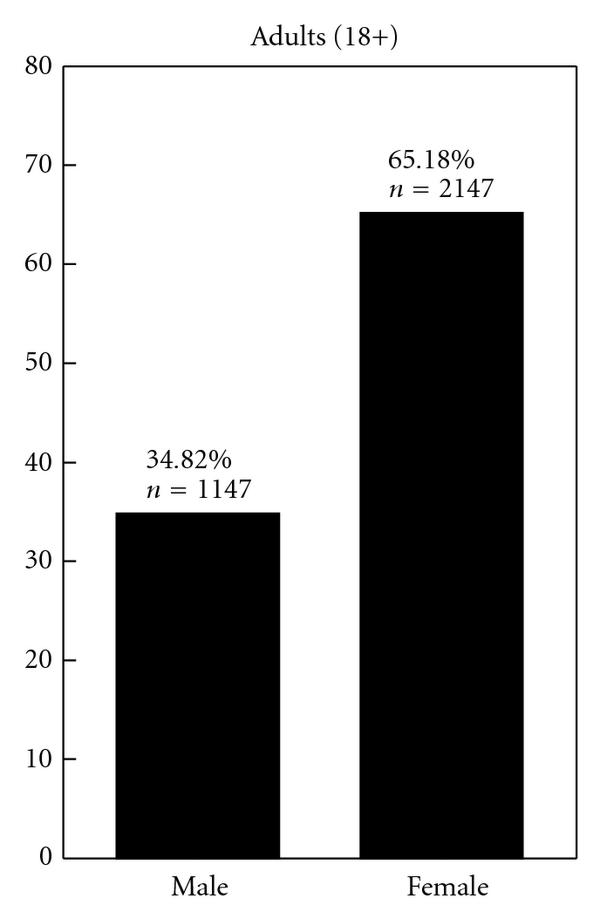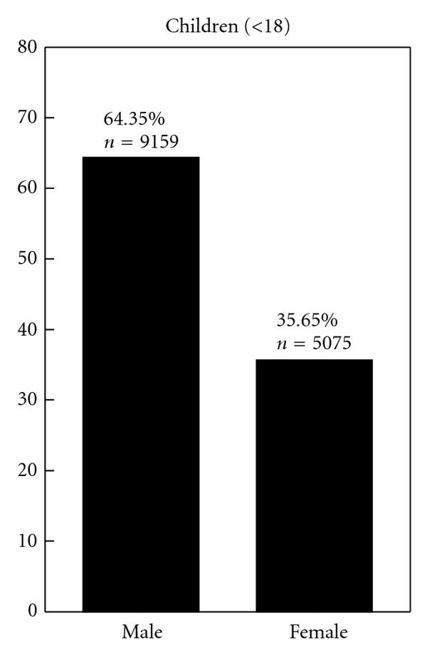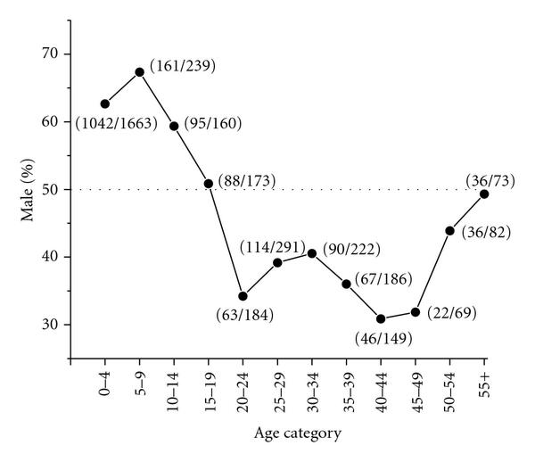 Our search of the PubMed database returned 4744 articles. Of these, 591 met the inclusion criteria, representing 17,528 food-allergic individuals. Analysis by age and sex revealed a sex bias in food allergy reporting (Figure 1). Among the food allergic children (18 years age) included in the analysis, 9159 (64.35%) were male and 5075 (35.65%) were female (male/female ratio of 1.80). Of the adults (18 years age) 1147 (34.82%) were male and 2147 (65.18%) were female (male/female ratio of 0.53). When information on specific ages was available, the data were further analyzed by classifying subjects into subgroups of age with five-year increments (Figure 2). This analysis once again revealed a sex disparity in food allergy reporting, in which males predominated at 0–4, 5–9, and 10–14 years age groups. No difference was apparent in the sex distribution in the 15–19 years age group. In older age groups most food allergy reporting was among females, until the age of 50–54 years, at which point the food allergy reporting was similar in both sexes (chi-squared for trend, ). Age at onset of food allergy was used in the analysis when information was available. The reporting of childhood onset of food allergy was similar in males (5.84% among males) and females (5.12% among females).