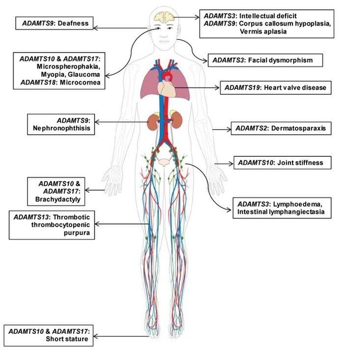 Clinical findings and distribution of affected organs in individuals with Mendelian disorders caused by pathogenic mutations in different ADAMTS family genes. Predominant and recurrently reported clinical presentations of eight ADAMTS genes with a strong causal relationship to Mendelian disorders are marked according to organ. Heterogeneous distribution of affected organ types indicates the phenotypic heterogeneity among hereditary disorders caused by pathogenic germline mutations in ADAMTS genes. FroRim JH, Choi YJ, Gee HY (March 2020). “Genomic Landscape and Mutational Spectrum of ADAMTS Family Genes in Mendelian Disorders Based on Gene Evidence Review for Variant Interpretation”. Biomolecules. 10 (3): 449. doi:10.3390/biom10030449PMC 7175297PMID 32183147.