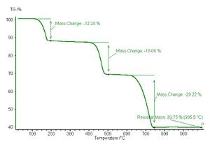 Whewellite (calcium oxalate monohydrate) heat decomposition mass curve. The whewellite decomposes first to anhydrous calcium oxalate, then to calcium carbonate (losing carbon monoxide), and finally to calcium oxide (losing carbon dioxide).