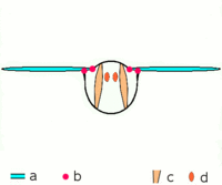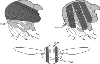 Dipteran insects along with the majority of other insect orders use what are known as indirect flight muscles to accomplish flight. Indirect insect flight muscles are composed of two sets of perpendicular muscles (see left figure) that are attached to the thorax (instead of directly to the wing base as is the case for direct flight muscles). When the first set of muscles contracts, they deform the body of the insect and compress its thorax vertically, which lifts the wings. When the first set of muscles relaxes and the second set contracts, the thorax is squeezed in the opposite direction, which extends the body vertically and moves the wings downward. The below figure demonstrates this movement with only the first set of muscles.