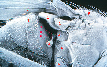structures: 1 calyptra (squama) 2 upper calypter (antisquama) 3 haltere 4 mesopleuron 5 hypopleuron