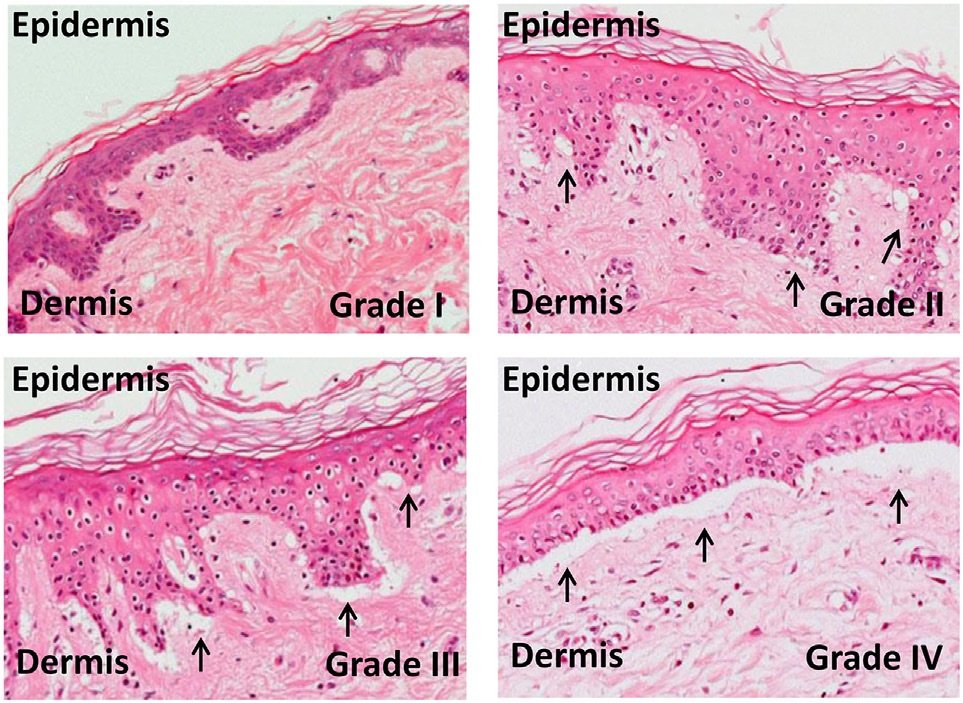 Micrographs of grades of skin graft-versus-host-disease: The outcome of the skin explant assay is histopathological damage ranging from grade I GvHR (with minimal vacuolization in the epidermis) to grade II GvHR (with vacuolization and dyskeratotic bodies) to grade III GvHR (with sub epidermal cleft formation) and finally to grade IV GvHR (with separation of the dermis from the epidermis).