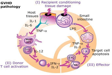 Activation of APC occurs in the first stage of GvHD. Prior to haematopoietic stem cell transplantation, radiation or chemotherapy results in damage and activation of host tissues, especially intestinal mucosa. This allows the microbial products to enter and stimulate pro-inflammatory cytokines such as IL-1 and TNF-α. These proinflammatory cytokines increase the expression of MHC and adhesion molecules on APCs, thereby increasing the ability of APC to present antigen. The second phase is characterized by the activation of effector cells. Activation of donor T-cells further enhances the expression of MHC and adhesion molecules, chemokines and the expansion of CD8 + and CD4 + T-cells and guest B-cells. In the final phase, these effector cells migrate to target organs and mediate tissue damage, resulting in multiorgan failure.