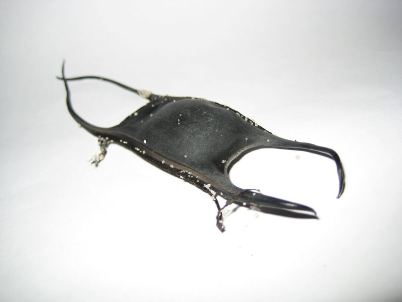 The longnose skate, Raja rhina, is considered a larger skate species; reaching a maximum size range of 145 cm total length.[11] Although their egg cases are smaller than that of the big skate, their cases are also considered large; ranging 93–102 mm in length.[1] Egg cases contain a single embryo. Longnose skate egg cases found in the field are brown in color. The external side is covered with a fibrous material, which is thicker on the top side and thinner on the bottom side of the case. The case is smooth underneath the fibrous material.[1]