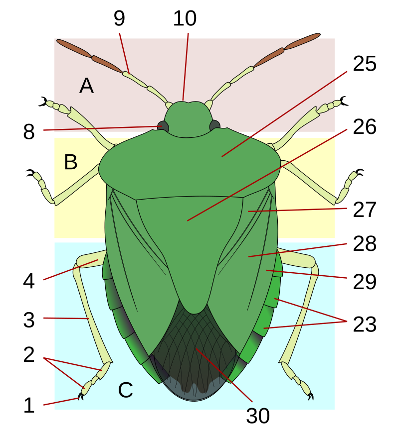 Morphology of dorsal side of shield bugs (Rhynchota: Pentatomoidea).A: head; B: thorax; C: abdomen. 1: claws; 2: tarsus; 3: tibia; 4: femur; 8: compound eye; 9: antenna; 10: clypeus; 23: laterotergites (connexivum); 25: pronotum; 26: scutellum; 27: clavus; 28: corium; 29: embolium; 30: membrane.