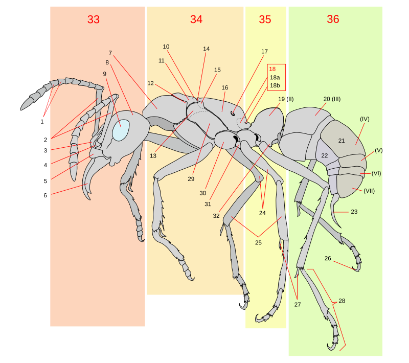 Members of suborder Apocrita (wasps, ants and bees) in the order Hymenoptera have the first segment of the abdomen fused with the thorax, which is called the propodeum. The head is connected to the thorax by the occipital foramen, enabling a wide range of motion for the head.[3]