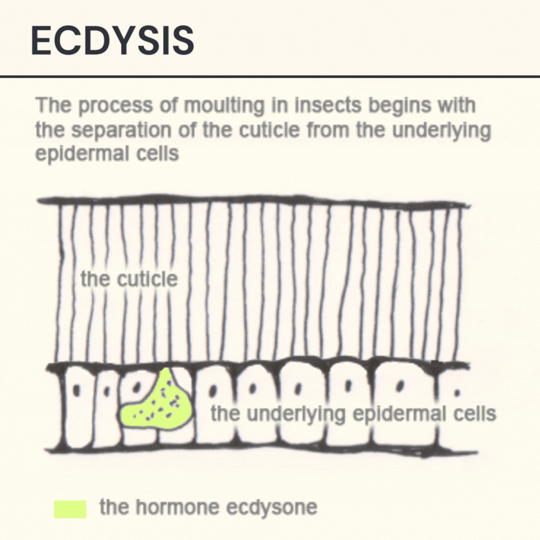 The process of moulting in insects begins with the separation of the cuticle from the underlying epidermal cells (apolysis) and ends with the shedding of the old cuticle (ecdysis). In many species it is initiated by an increase in the hormone ecdysone. This hormone causes: